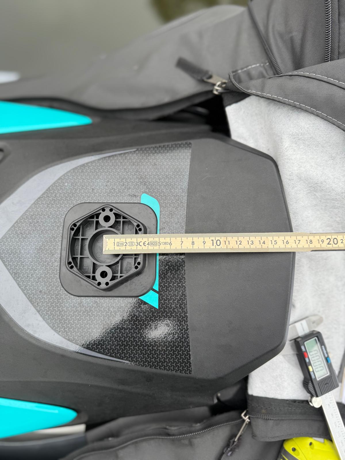 Fram: Fäst det främre fästet med dubbelhäftande tejp eller, för bästa hållbarhet, borra två små hål (7 mm borr) och montera med bult och mutter (10 mm hylsa, 5 mm insex). Se bilder för mått ! Mät dock själv så du gör rätt ! Lita inte på att våra bilder eller mått är korrekta!